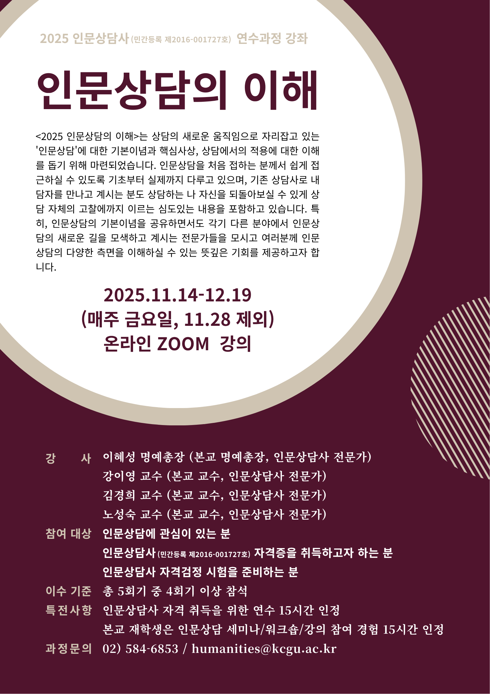 (강의 1개당 4만5천원 / 인문상담사 연수시간은 인정되지 않음 / 부분신청은 메일 humanities@kcgu.ac.kr)