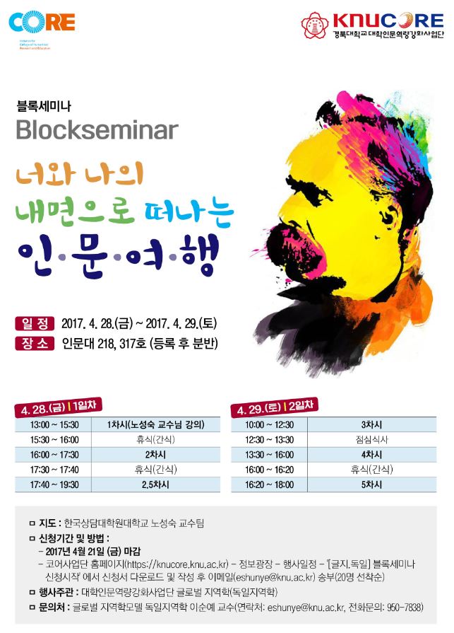 인문상담학연구소 ‘철학상담연구팀’은 4월 28일 ~ 29일 경북대학교 독어독문학과 재학생 20여명을 대상으로 인문상담프로그램 <일상한 나라의 니체씨, 별짓하다>를 진행하였다. 본 프로그램은 경북대 CORE 사업단의 ‘대학생에게 성적이나 취업 중심이 아닌 실질적이며 근본적인 인문학적 역량강화가 필요하다’는 문제의식에서 출발하여 자신의 고유성 성찰 및 잠재력 계발을 위해 ‘철학의 가능성을 인문상담학을 통해 실현한다’는 목표를 가지고 개발되었다.