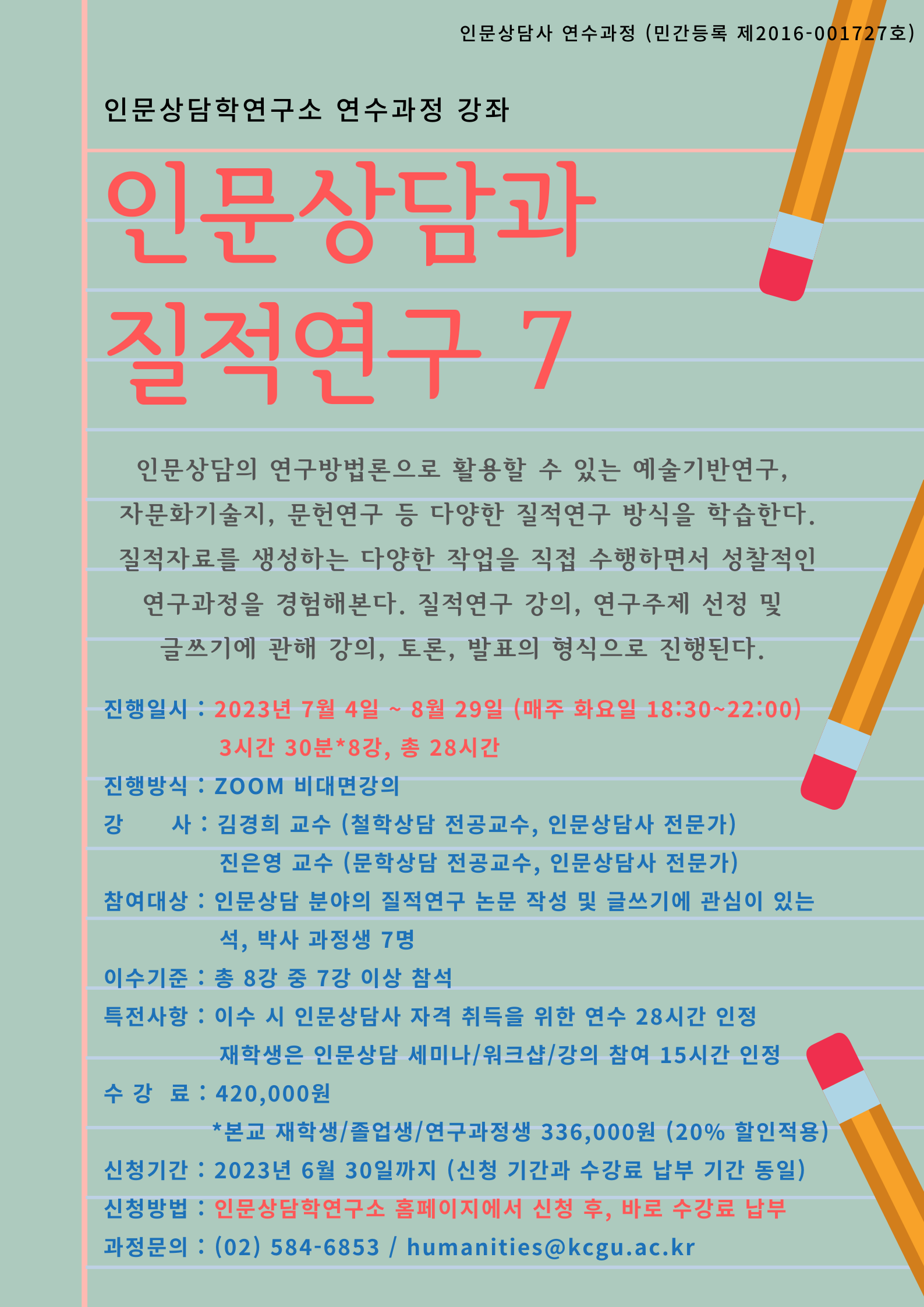인문상담 분야의 질적연구 논문 작성 및 글쓰기에 관심을 가지고 계신 석박사생들의 많은 참여 바랍니다.