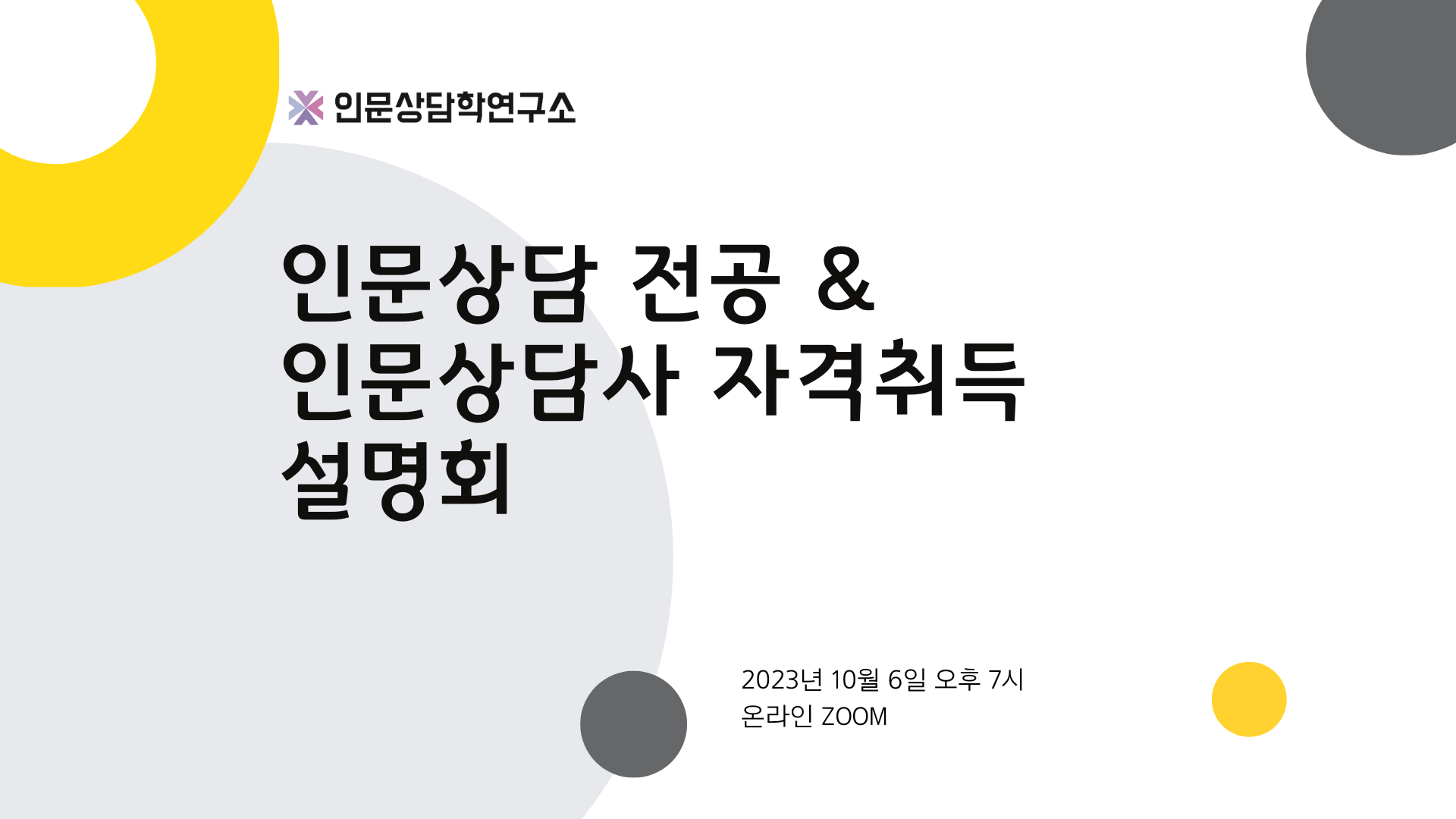 인문상담학연구소는 본교 재학생과 졸업생들 사이에서 인문상담 전공 및 인문상담사 자격취득을 향한 관심이 높아지는 가운데 그에 관한 이해를 돕고자 지난 10월 6일 금요일 저녁 7시, <인문상담 전공 및 인문상담사 자격취득 설명회>를 온라인으로 시행하였다. 전임연구원 차하나(철학상담 박사수료/인문상담사 2급)는 인문상담에 관심 있는 본교 재학생 및 졸업생 14명을 대상으로 인문상담사 자격증을 취득하기 위한 교육과정에 정규학위과정으로 개설되는 공필B/인문상담 현장실습/인문상담 전공과목과 인문상담학연구소에서 주관하는 연수과정(강좌/집단 프로그램)이 있음을 안내하고, 인문상담사 3급과 2급의 응시자격, 인문상담사 자격검정시험에 대한 상세한 정보들을 공유한 뒤, 참여자들과의 질의응답으로 추가적인 궁금증들을 함께 해소하고자 하였다.