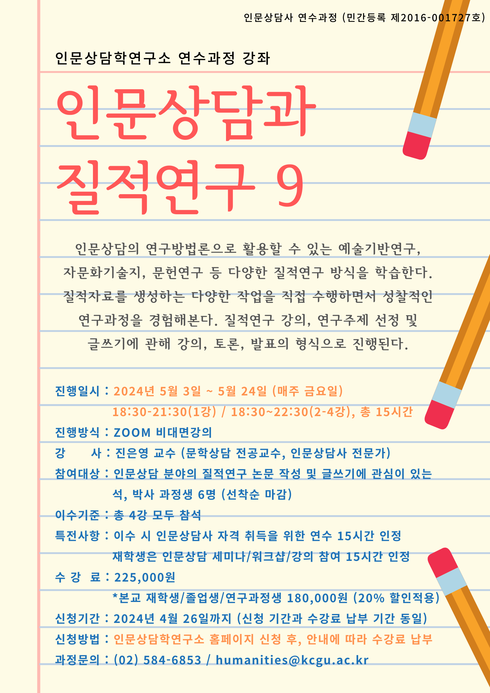 인문상담 분야의 질적연구 논문 작성 및 글쓰기에 관심을 가지고 계신 석박사생들의 많은 참여 바랍니다.