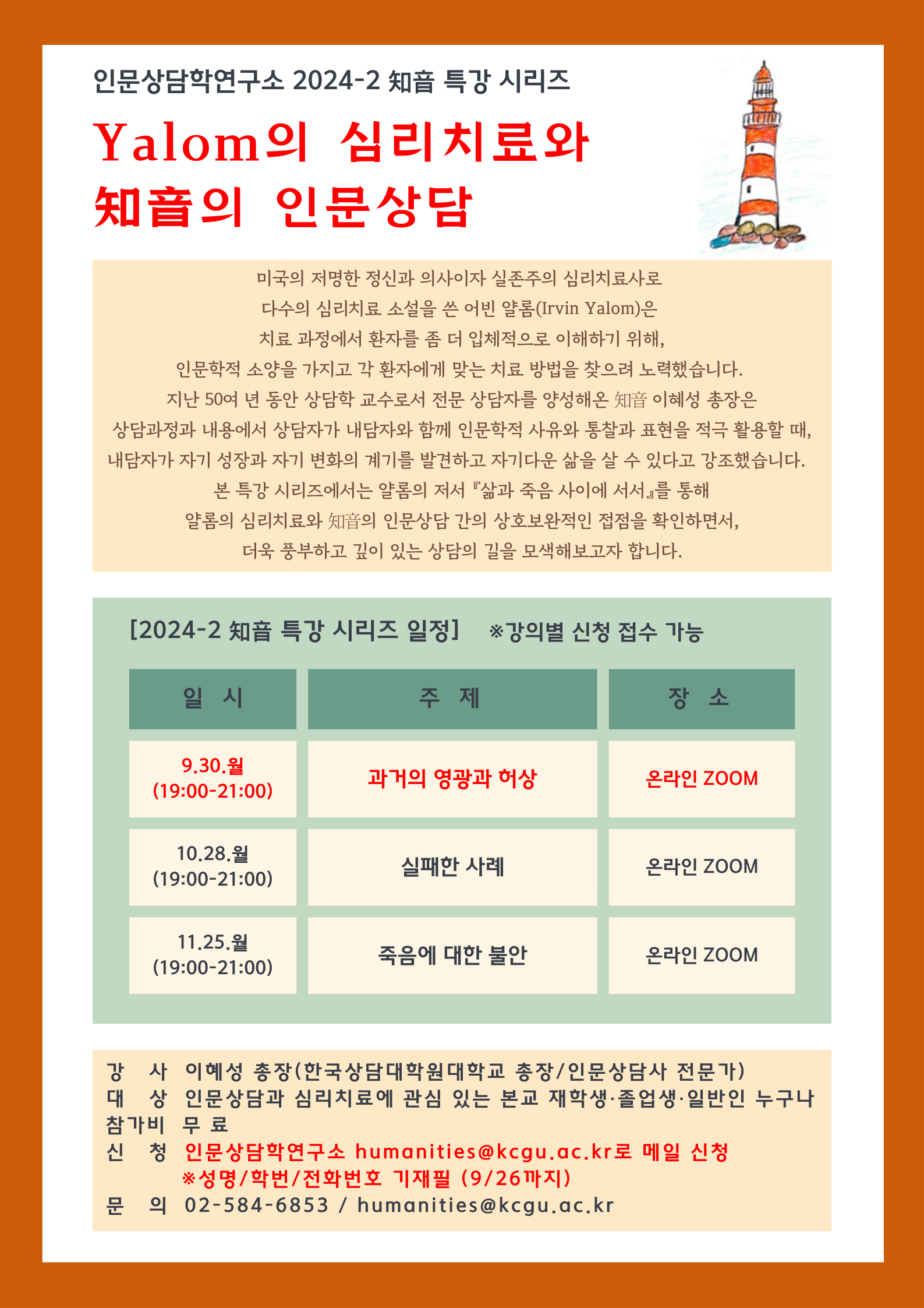 • [2408] 2024-2 知音 특강 시리즈 4 : Yalom의 심리치료와 知音의 인문상담 (0) 관리자 LV.48 1 6 2024-08-28 10:06