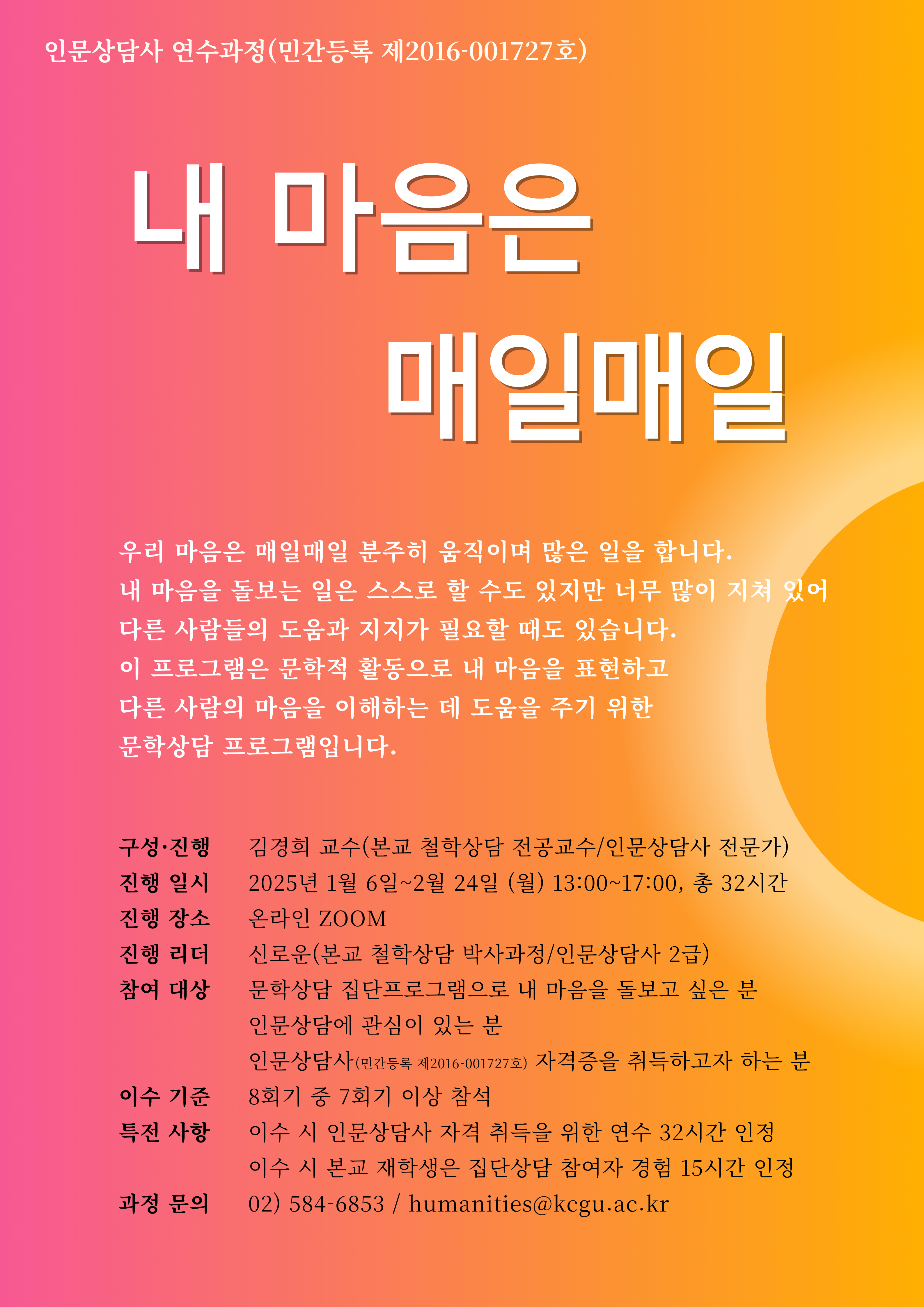 인문상담학연구소는 문학적 활동으로 자신의 마음을 표현하고 다른 사람의 마음을 이해하는 데 도움을 주기 위한 문학상담 집단 프로그램 <내 마음은 매일매일>을 지난 1월 6일부터 2월 24일까지 매주 수요일 총 32시간에 걸쳐 온라인으로 진행하였다. 본교 김경희 교수(철학상담·문학상담 전공교수, 인문상담사 전문가)가 강의 및 진행을 총괄하고, 철학상담 박사과정생 신로운(인문상담사 2급)와 문학상담 박사과정생 김경희(전임연구원, 인문상담사 2급)가 진행 리더로 참여한 본 프로그램은 ‘어울린다’, ‘첫 수업’, ‘코기토씨의 가방’, ‘○○○를 쓴 사람’, ‘나의 각도’, ‘두 사람’, ‘모든 장소를 즐겼다’, ‘내 마음은 매일매일’의 8가지 주제로 구성되었다.