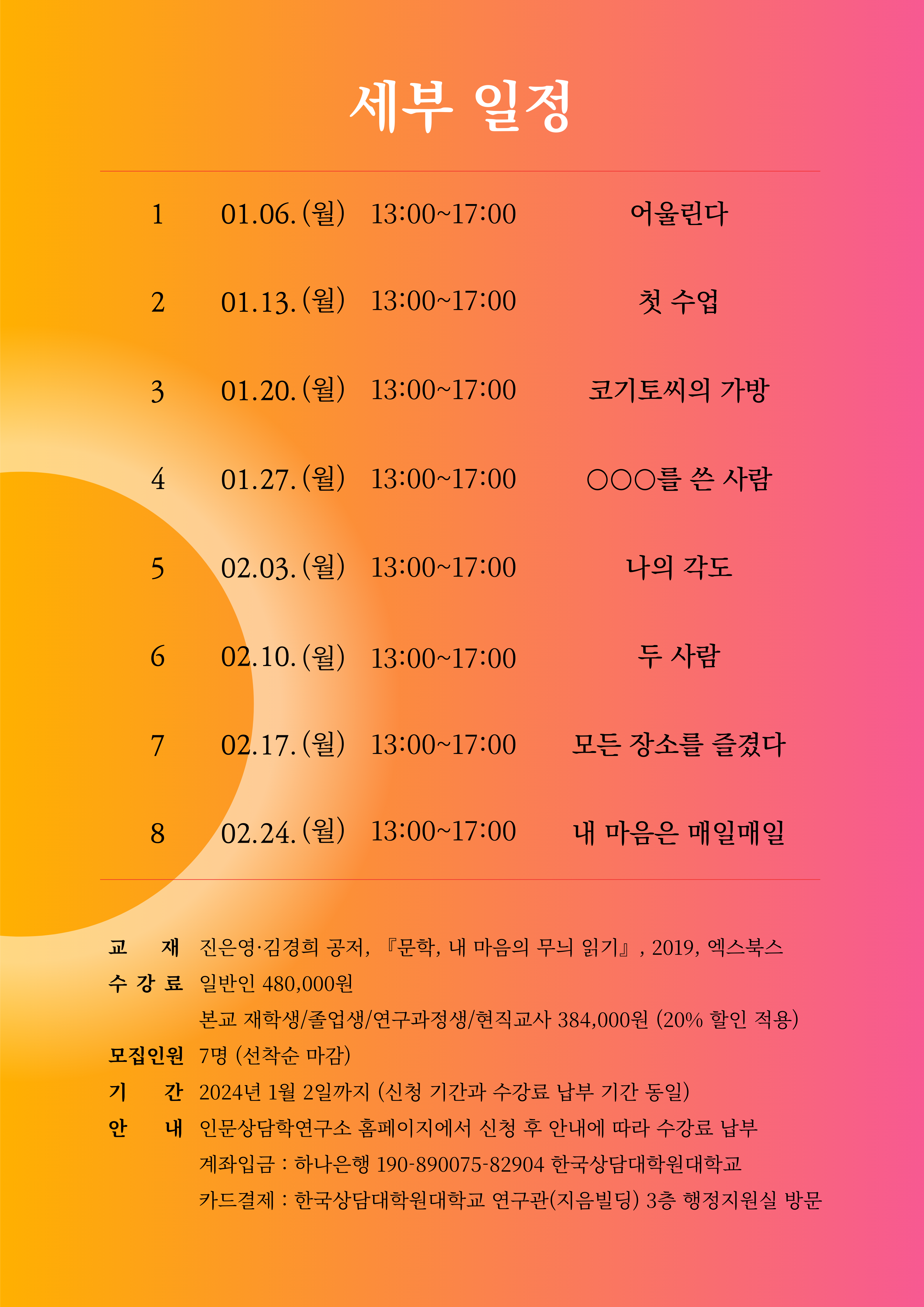 인문상담사(민간등록 제2016-001727호) 연수과정인 본 프로그램에서 본교 재학생 및 인문상담에 관심이 있는 일반인으로 이루어진 참여자들은 익숙해진 삶의 풍경을 다양한 인문학적 촉진과 함께 자신의 삶을 새로운 관점에서 돌아보고 문학적 유희를 통해 치열한 삶 속의 고민들을 시로 녹여내며 서로 다른 마음을 가진 사람들을 시 속에서 맞이하고 환대하며 자신과 타인과 세계를 바라보는 시선의 각도를 넓힐 수 있었다.