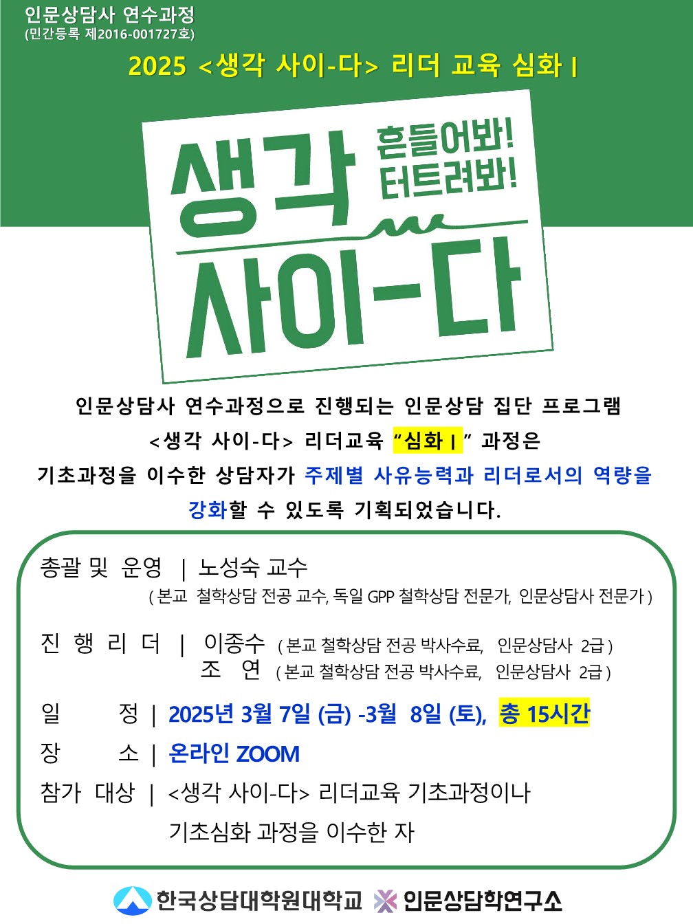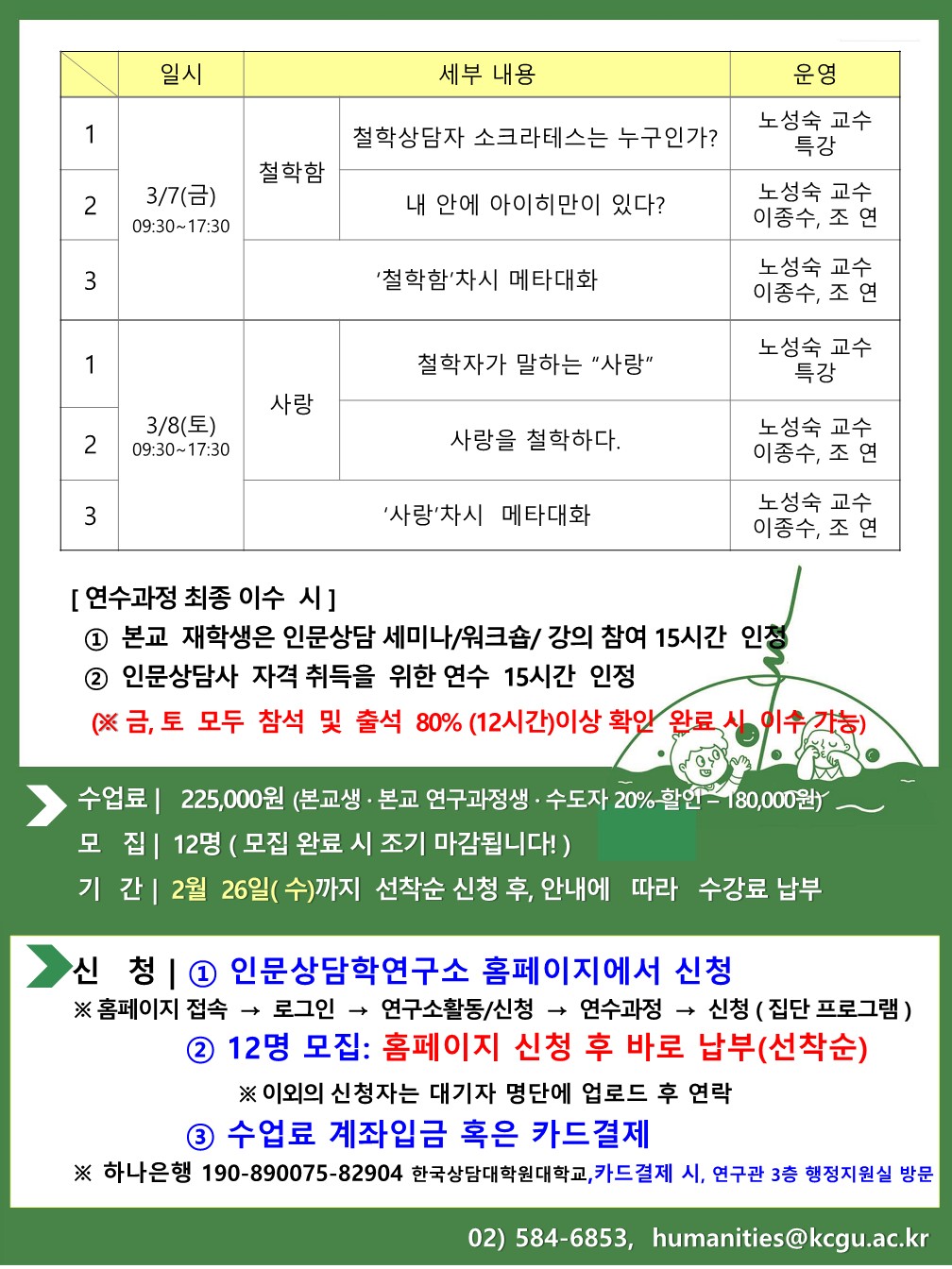 인문상담학연구소는 지난 3월 7,8(금,토)일 양일간 본교 철학상담 전공 노성숙 교수가 총괄하고 이종수, 조연(철학상담전공 박사수료, 인문 상담사 2급)이 리더로 참여하는 <생각 사이-다> 리더교육 심화1 과정을 진행하였다. 기존과 달리 변화된 방식은 노성숙 교수의 ‘철학함’, ‘사랑’에 대한 강의를 듣고자 하는 원생들의 요구를 반영하여 강의만을 선택 수강할 수 있도록 열어두었다는 것이다. 2모둠으로 구성하였고 전일 참여한 분 10명, 강의만을 선택 수강한 분 4명, 총 14분이 참여하였다.