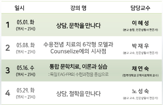 인문상담학연구소는 5월에 운영되는 <2018 인문상담의 기초> 강좌에 대한 강의별 수강 신청을 받고자 합니다.