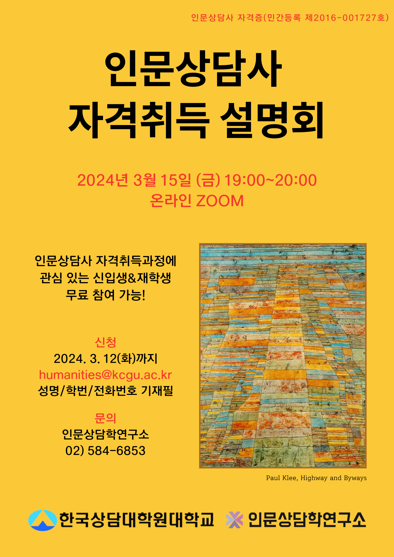 인문상담학연구소 메일 humanities@kcgu.ac.kr로 3/12(화)까지 신청